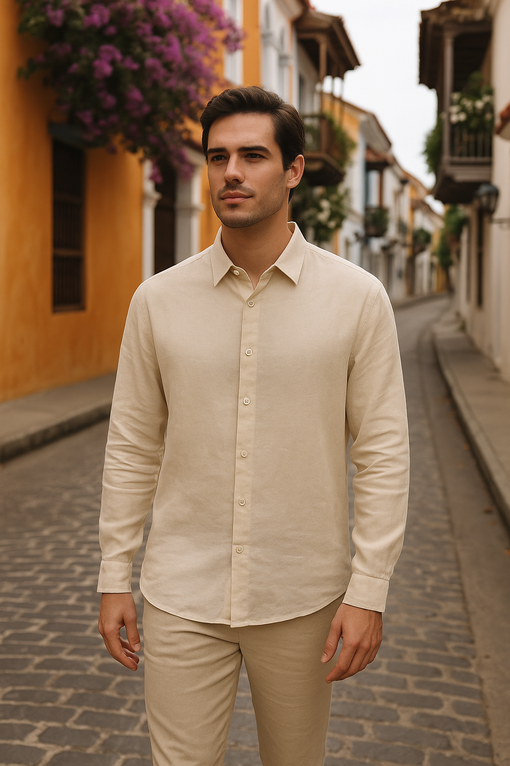 Camisa manga larga en lino de caballero con corte clasico, diseño fresco, elegante y versatil, Ideal para cualquier ocasion.