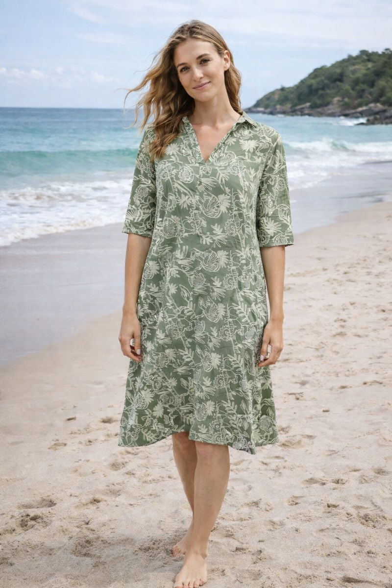 Vestido de dama en tela de lino con estampado en hilo que transmite frescura y elegancia