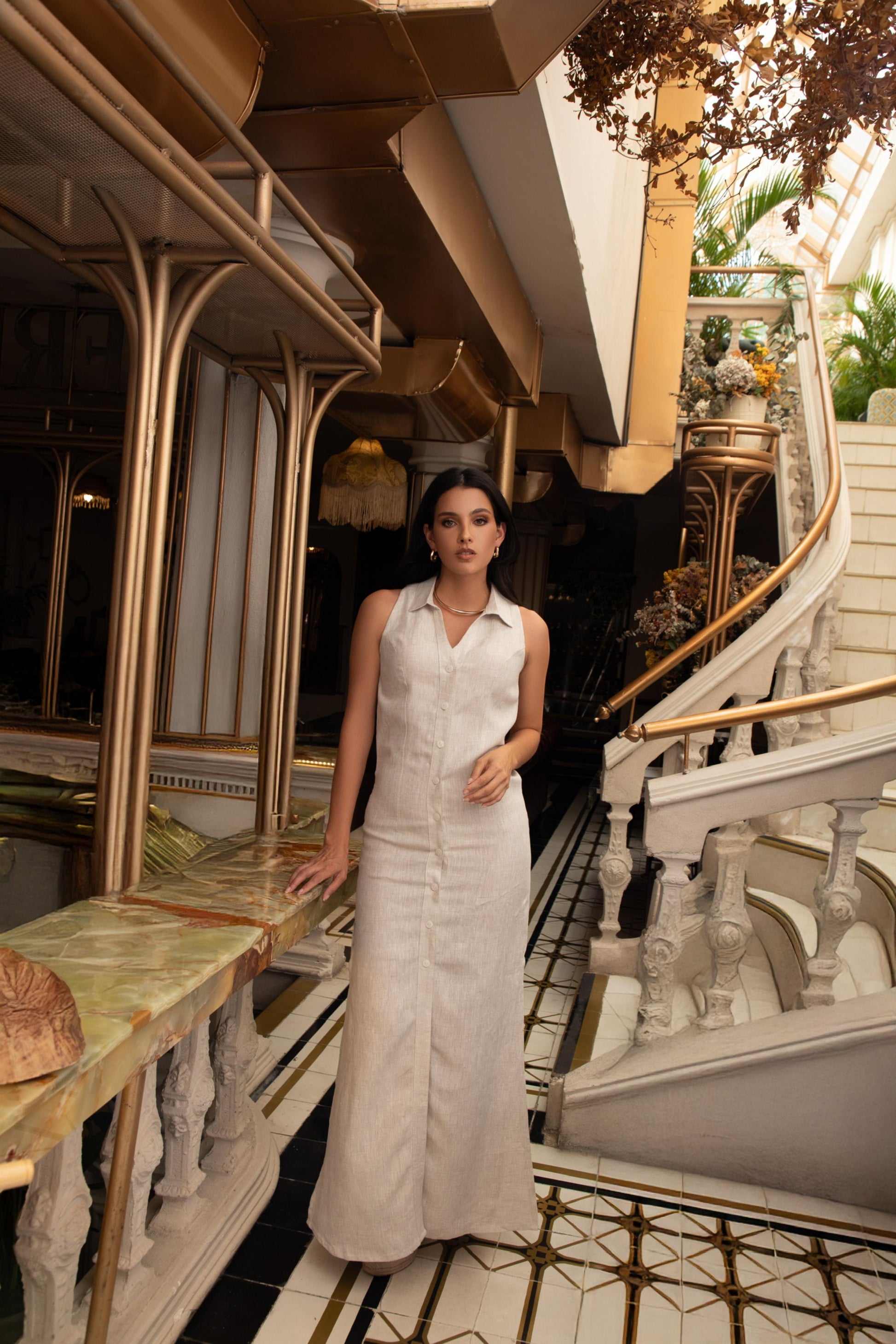 El Vestido Dama Buzios es una prenda diseñada para resaltar frescura, elegancia y comodidad. Confeccionado en lino, destaca por su vestido con cuello largo dama en lino. Disponible en colores blanco y natural, se adapta a distintos estilos y ocasiones, ideal tanto para climas cálidos como para eventos sociales y casuales.